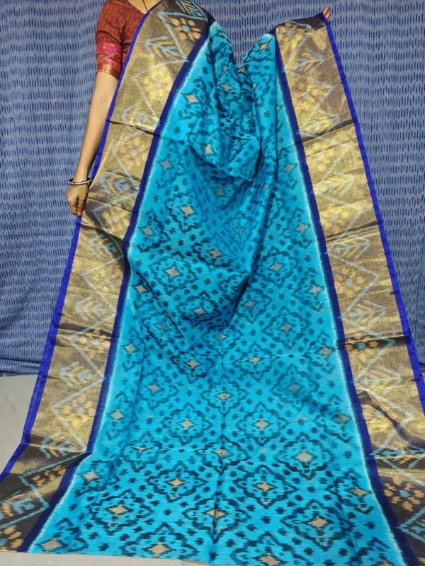 Pure Ikkat Sico Silk Cotton Sarees, 8 Inch Border Handloom Saree With Blouse