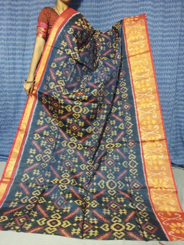 Pure Ikkat Sico Silk Cotton Sarees, 8 Inch Border Handloom Saree With Blouse