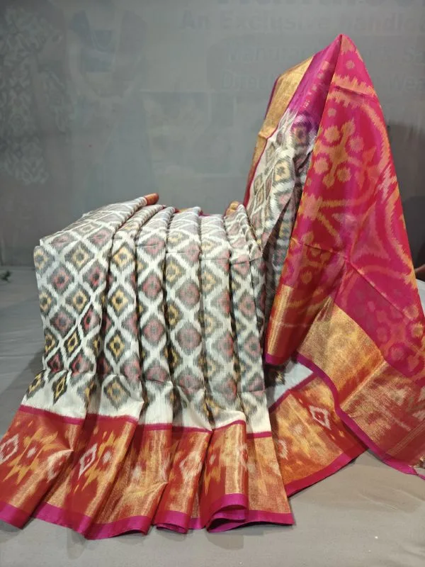 Pure Ikkat Sico Silk Cotton Sarees, 8 Inch Border Handloom Saree With Blouse