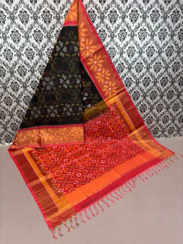 Pure Ikkat Sico Silk Cotton Sarees, 8 Inch Border Handloom Saree With Blouse
