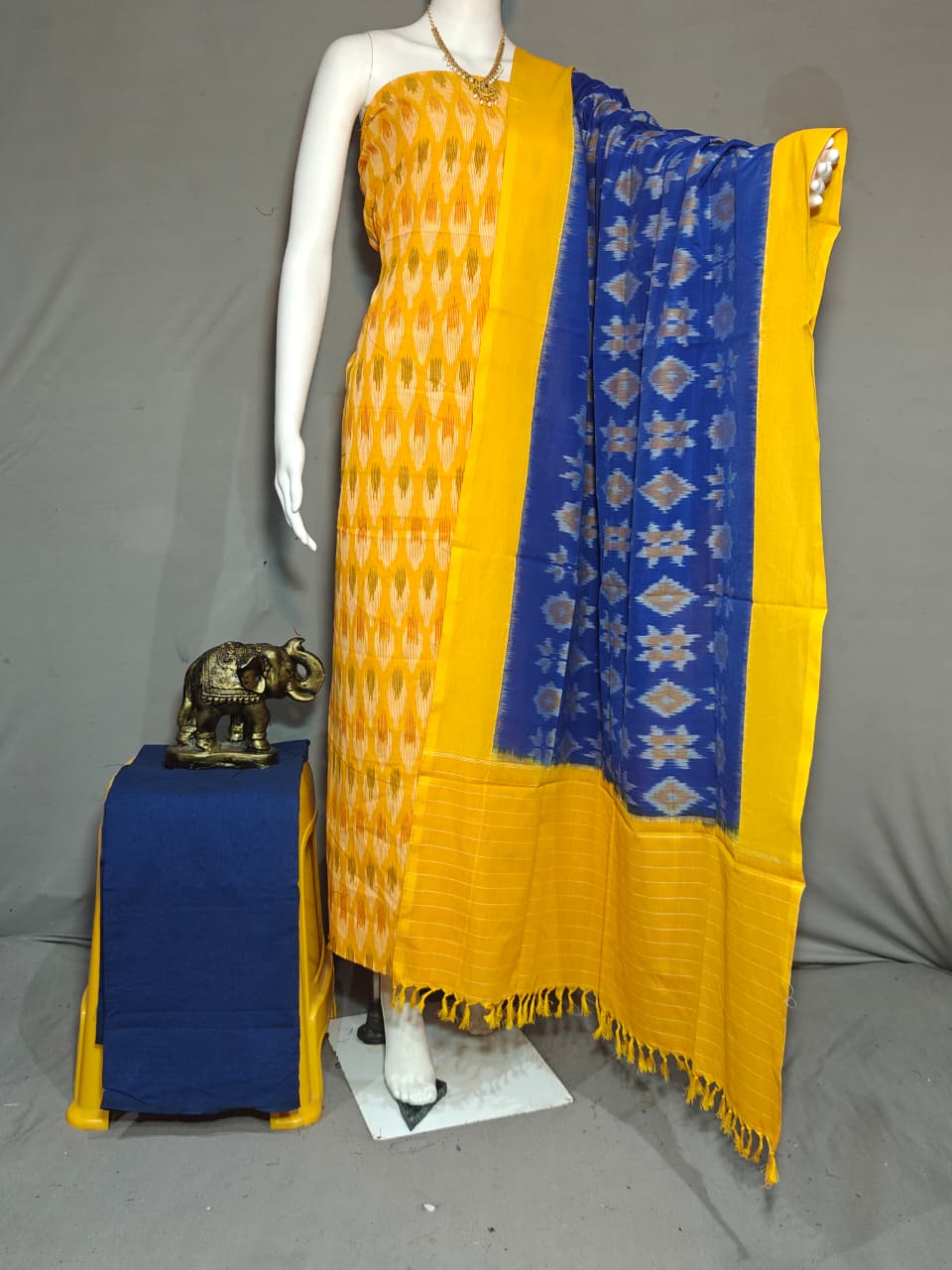 Pochampally Double Ikkat Cotton Dress Materials, Handloom Cotton Unstitched Ethnic Dress Materials