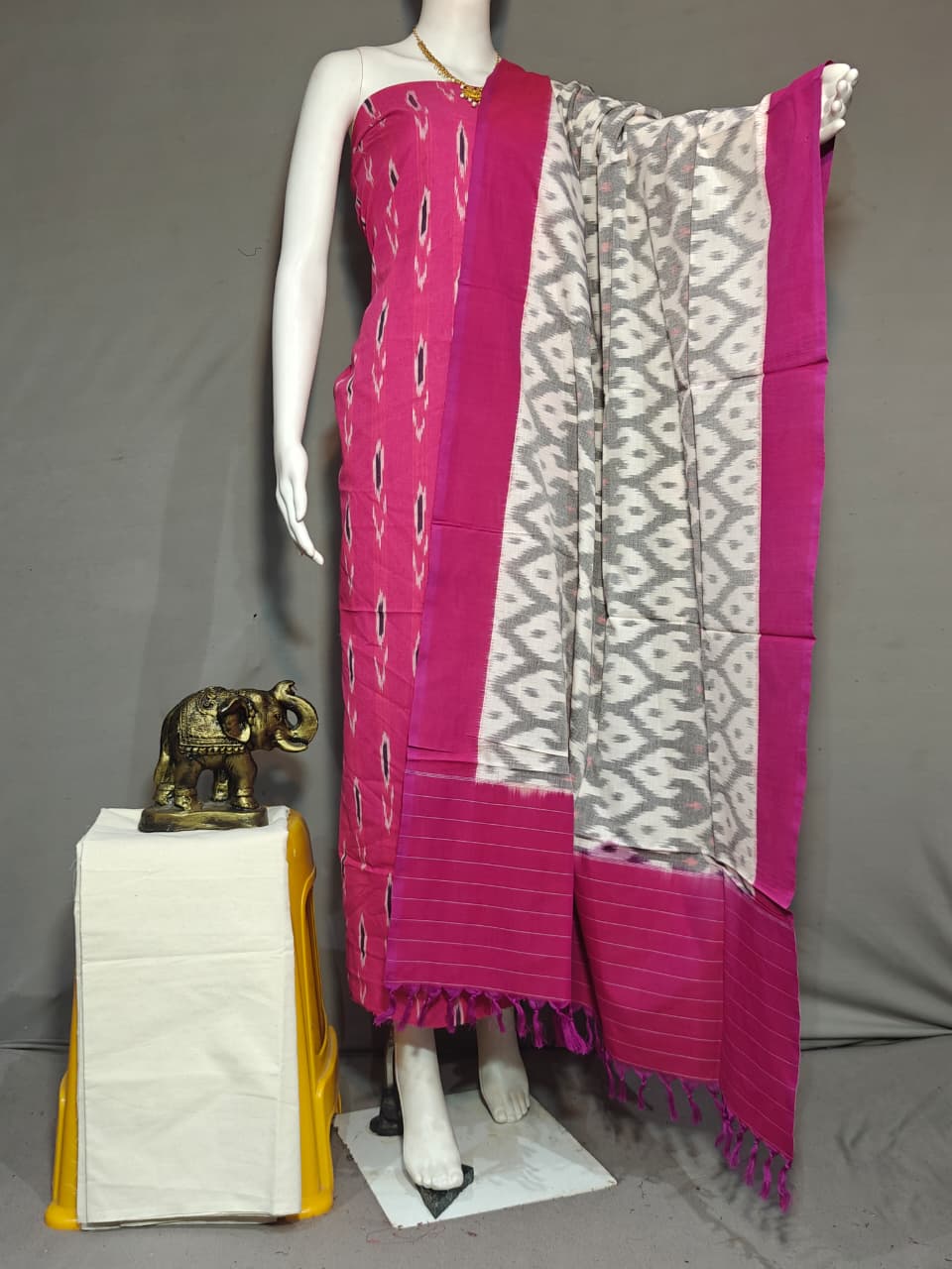 Pochampally Double Ikkat Cotton Dress Materials, Handloom Cotton Unstitched Ethnic Dress Materials