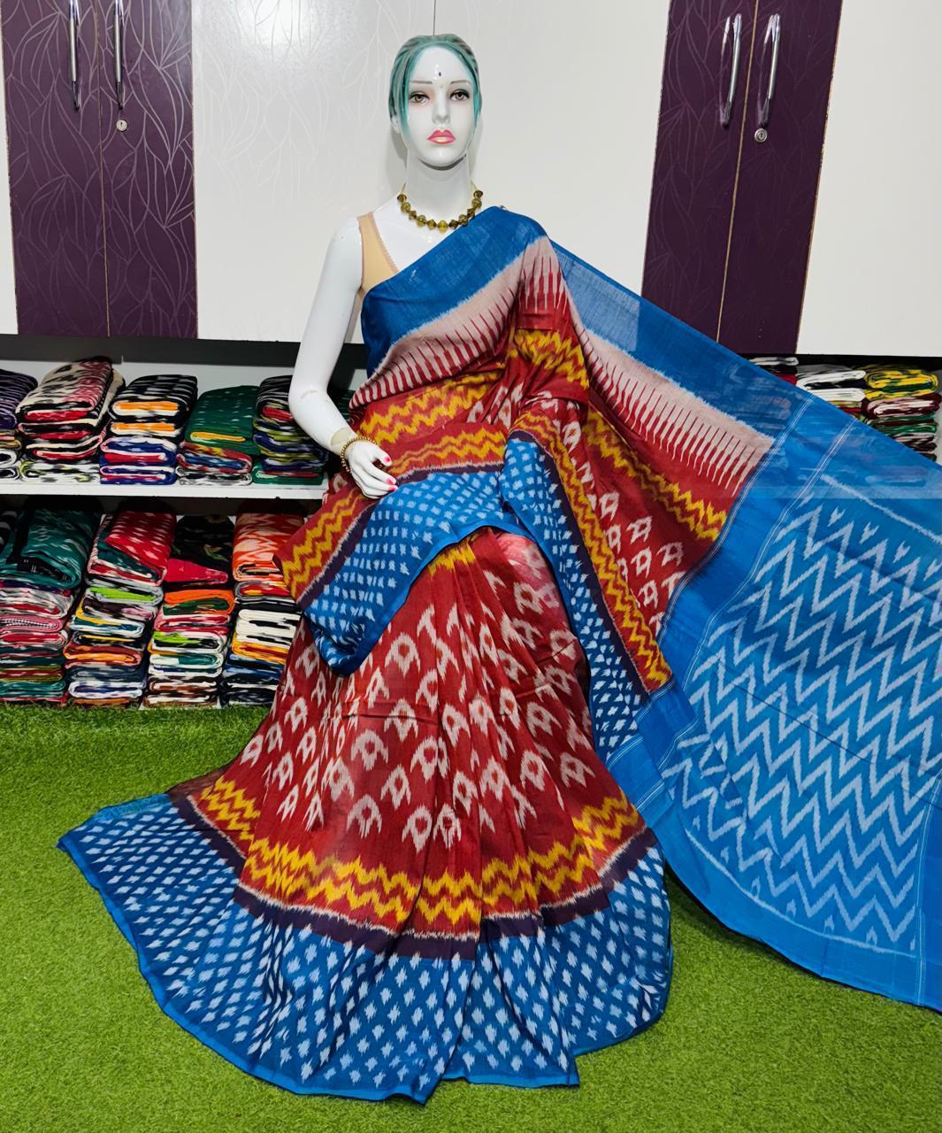 Double Ikkat Pochampally Mercerized cotton saree Light Weight With Blouse | Handloom Sarees